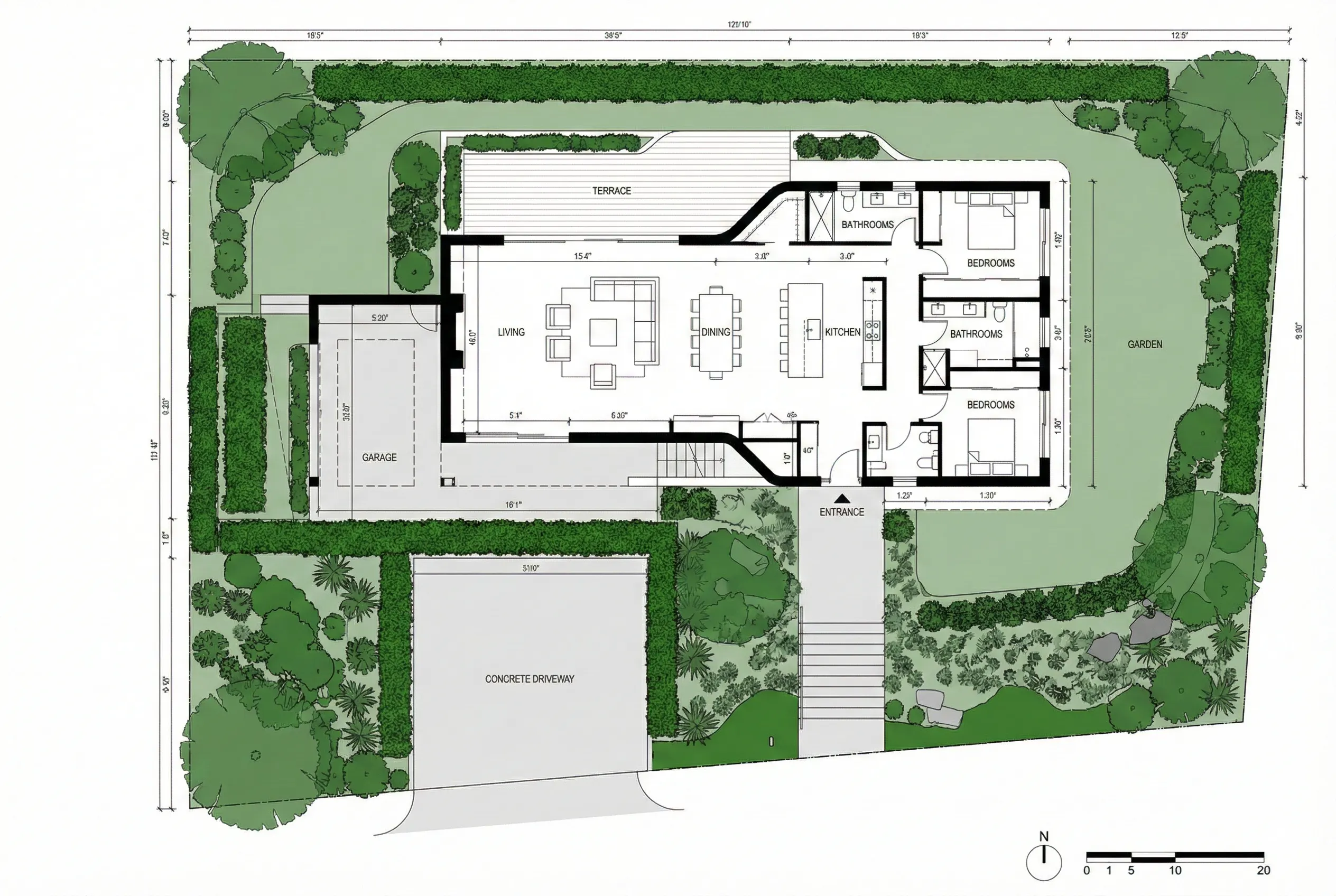 A Sculptural Living Space Characteristic clean lines and bold cantilevered structures define the home's silhouette. HORIZON is more than just a building; it is a harmonious blend of concrete, glass, and greenery that blurs the boundaries between interior and exterior, maximizing the experience of modern living.